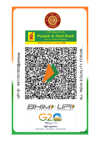 | A/c Name: ALL INDIA EQUALITY FORUM Account no. – 01341000031309 Bank Name & Branch: Punjab and Sind Bank, Jogiwala, Dehradun Ifsc code: PSIB0000134 |